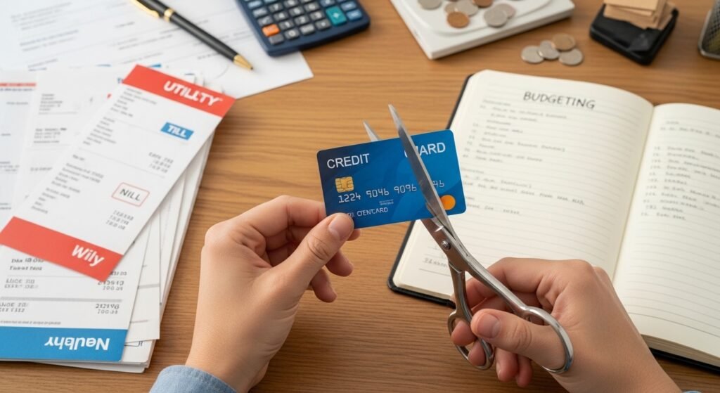 Stop using credit cards immediately while paying them off. You will stay on a debt treadmill which moves faster than your current pace when you continue to swipe your card.