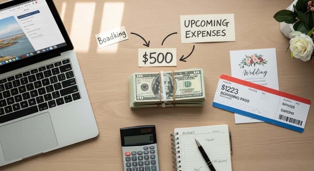 You should allocate $500 to save for upcoming expenditures which include purchasing a new laptop and booking a flight to attend a friend’s wedding. The plan stops lifestyle creep from diminishing your fundamental savings when these expenses occur.