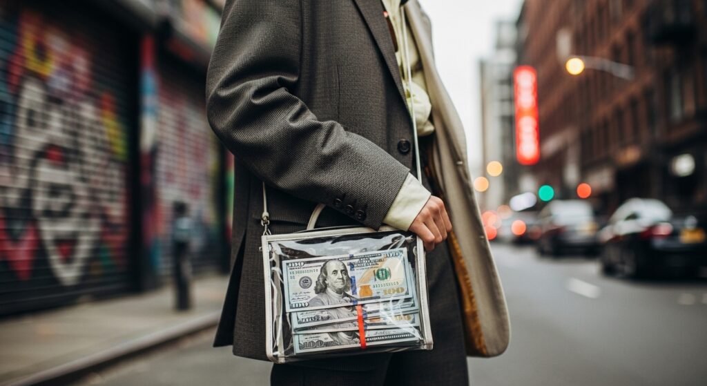 Streetwear brands are releasing “transparent” bags specifically designed to show off a stack of cash. The user can wear their liquid assets as they want because this “conspicuous consumption” practice enables them to display their wealth through their clothing.