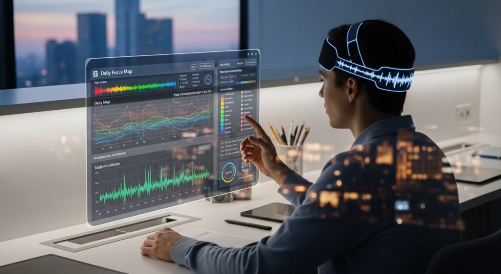 The Neurosity Crown device works to assist users in achieving a “flow state” which represents their complete immersion into their work activities. The system monitors brain activity through its brainwave tracking function which provides haptic signals to users about their approaching maximum productivity situation.