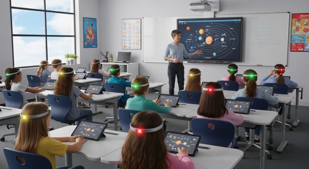 Some versions used in classrooms feature a light on the forehead that changes color based on focus. The red light indicates maximum concentration while the blue light shows the student has entered a state of daydreaming. The system provides teachers with an instant overview of student requirements without disturbing their current lesson.
