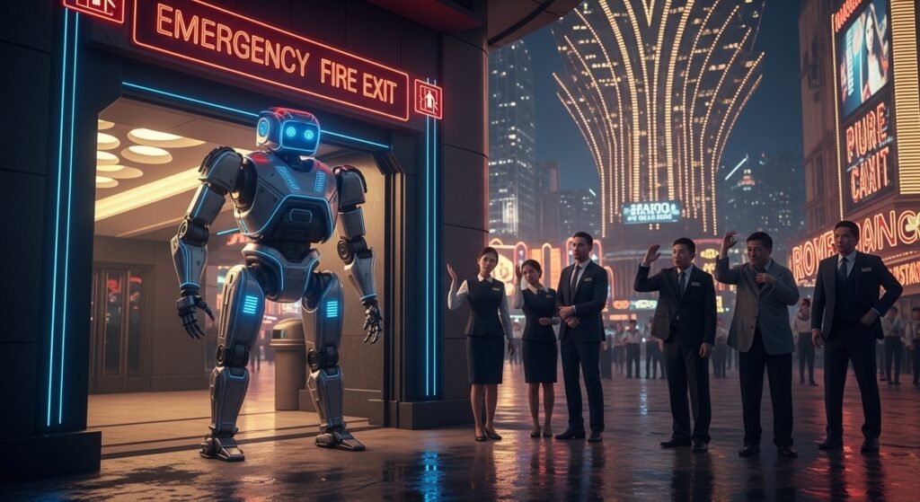 The robot was found wandering into a restricted government-owned sidewalk outside the casino’s property line. The area needed a work visa for public land. Therefore, the robot should have been detained when it entered the territory without authorization.