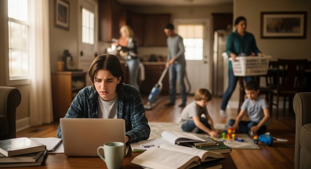 Your “classroom” serves multiple purposes because it functions as your sleeping area and dining space and recreation zone. Your attempts to concentrate on work become difficult because the washing machine operates and family members move throughout the house.