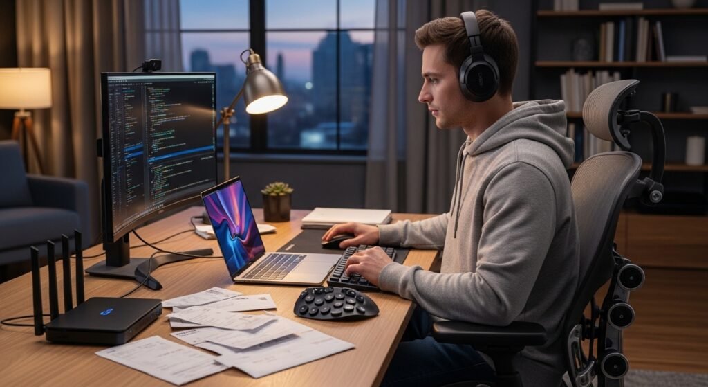 You save money on gasoline, but your expenses increase because you need to purchase high-speed internet and premium software and special furniture to maintain comfort during long desk work.